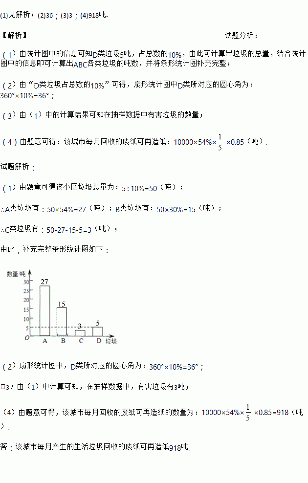 ,若每回收1吨废纸可再造纸0.85吨.假设该城市每月产生的生活垃圾为10000吨,且全部分类处理,那么每月回收的废纸可再造纸多少吨?