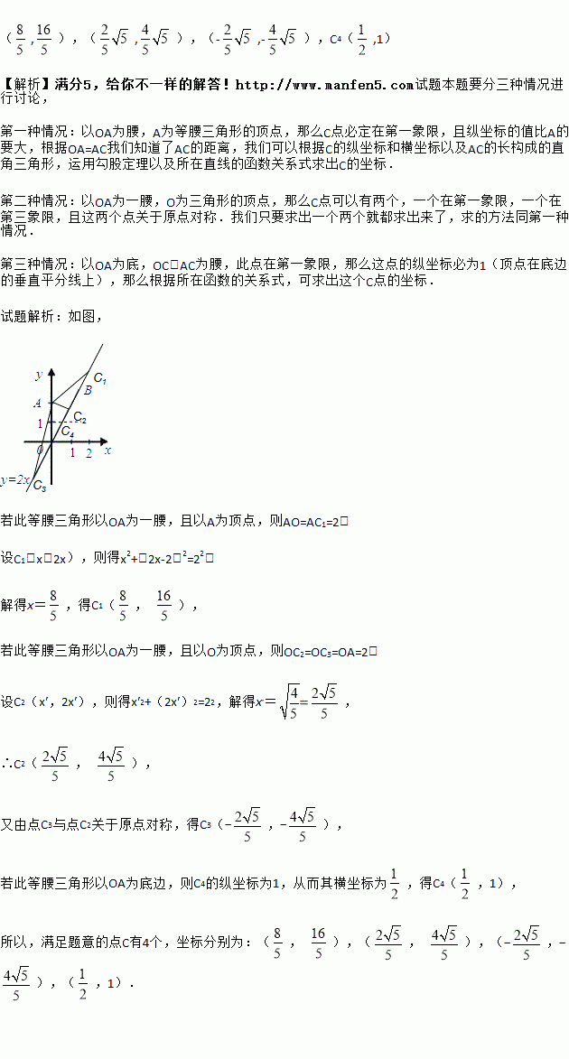 如图,直线OB是一次函数y=2x的图象,点A的坐标是(0,2),点C在直线OB上且△ACO为等腰三角形,求C点坐标.