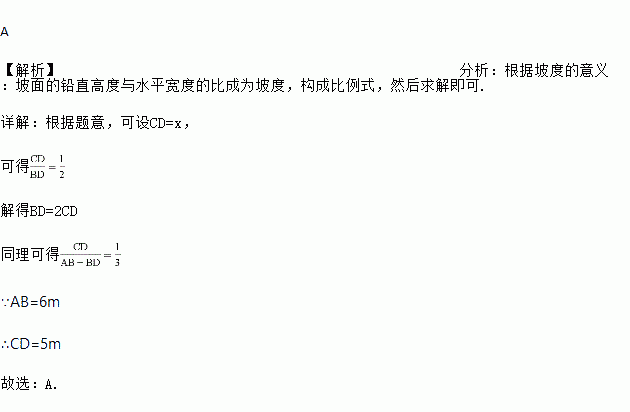 解放路上一座人行天桥如图所示,坡面BC的坡度(坡面的铅直高度与水平宽度的比成为坡度)为1:2,为了方便市民推车过天桥,有关部门决定在保持天桥高度的前提下,降低坡度,使新坡面AC的坡度为1:3,AB=6m,则天桥高度CD为 ( )