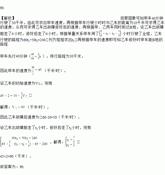 地,分别以一定的速度匀速行驶,甲车先出发40分钟后,乙车才出发.途中乙车发生故障,修车耗时20分钟,随后,乙车车速比发生故障前减少了10千米/小时(仍保持匀速前行),甲、乙两车同时到达![]()