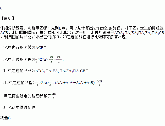 图中的五个半圆,邻近的两半圆相切,两只小虫同时出发,以相同的速度从A点到B点,甲虫沿ADA1、A1EA2、A2FA3、A3GB路线爬行,乙虫沿ACB路线爬行,则下列结论正确的是( )