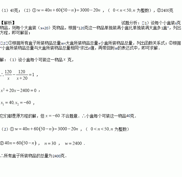 (2)现有装满这一物品两种盒子共50个.设小盒有n个,所有盒子所装物品的总量为w克.