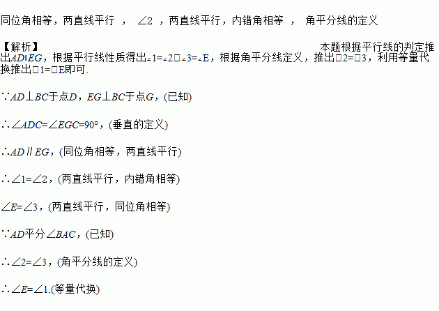 如图,AD⊥BC于点D,EG⊥BC于点G,AD平分∠BA C. 求证: ∠E=∠1.