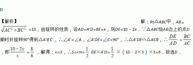 如图,在Rt△ABC中,∠C=90°,AC=6,BC=8,把△ABC绕AB边上的点D顺时针旋转90°得到△A′B′C′,A′C′交AB于点E,若AD=BE,则△A′DE的面积是( )