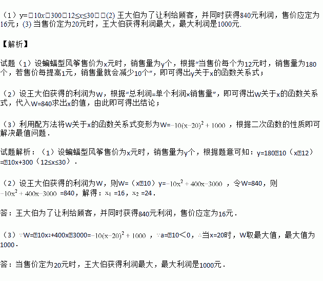 (1)用表达式表示蝙蝠形风筝销售量y(个)与售价x(元)之间的函数关系(12≤x≤30);