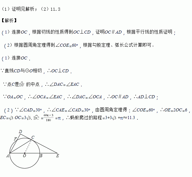 (2)若∠CAD=30°.⊙O的半径为3,一只蚂蚁从点B出发,沿着BE--EC--弧CB爬回至点B,求蚂蚁爬过的路程(π≈3.14,