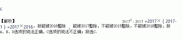 C 【解析】=2017×(2017-1)=2017×2016,故能被2016整除 , 能被2017整除,不能被2015整除,不能被2018整除,故A、B、D选项的说法正确,C选项的说法不正确;故选C.