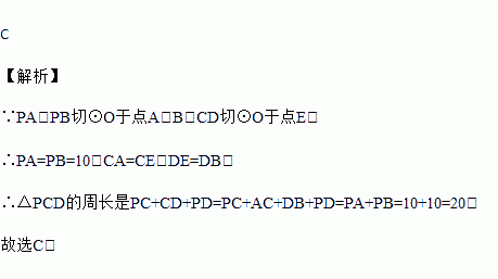 如图,PA、PB切⊙O于点A、B,PA=10,CD切⊙O于点E,交PA、PB于C、D两点,则△PCD的周长是( )