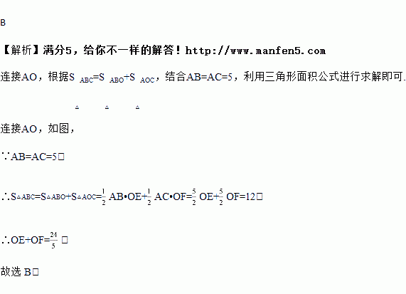 如图,ABC是等腰三角形,点O 是底边BC上任意一点,OE、OF分别与两边垂直,等腰三角形ABC的腰长为5,面积为12,则OE+OF的值为