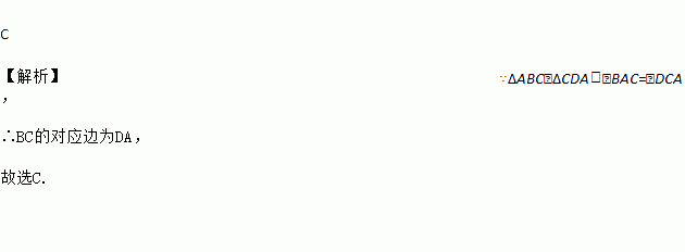 如图,ΔABC≌ΔCDA,∠BAC=∠DCA,则BC的对应边是 ( )