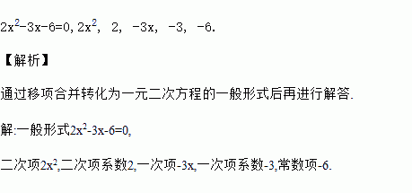 将一元二次方程2x-6=-2x2+5x化为一般形式,并写出它的二次项,二次项系数,一次项,一次项系数和常数项.