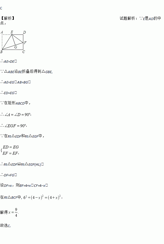 如图,矩形ABCD中,E是AD的中点,将△ABE沿直线BE折叠后得到△GBE,延长BG交CD于点F.若AB=4,BC= 6,则FD的长为( )