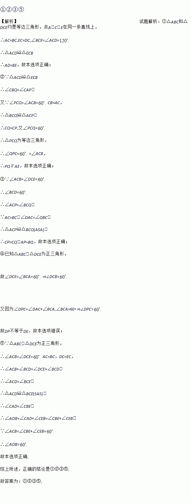 如图,C为线段AE上一动点(不与点A、E重合),在AE同侧分别作正△ABC和正△CDE,AD与BE交于点O,AD与BC交于点P,BE与CD交于点Q,连接PQ.以下五个结论:①AD=BE;②PQ∥AE;③AP=BQ;④DE=DP;⑤∠AOB=60°.
