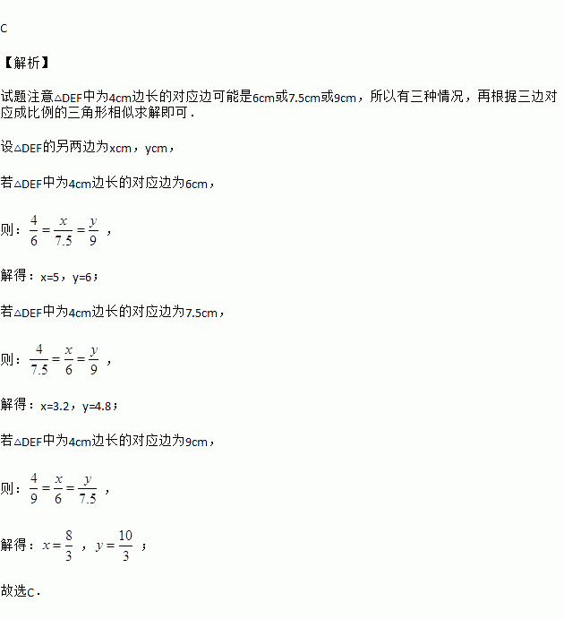 已知△ABC的三边长分别为6 cm,7.5 cm,9 cm,△DEF的一边长为4 cm,当△DEF的另外两边长是下列哪一组时,这两个三角形相似( )