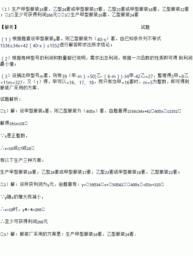 下岗职工王阿姨利用自己的﹣技之长开办了“爱心服装厂”,计划生产甲、乙两种型号的服装共40套投放到市场销售.已知甲型服装每套成本34元,售价39元;乙型服装每套成本42元,售价50元.服装厂预计两种服装的成本不低于1536元,不高于1552元.
