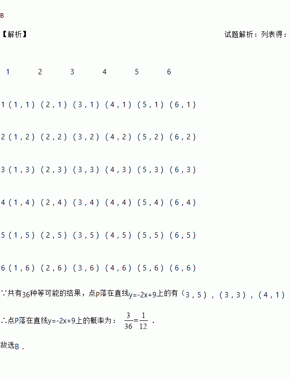 同时抛掷A,B两个均匀的小立方体(每个面上分别标有数字1,2,3,4,5,6),设两立方体朝上的数字分别为x,y,并以此确定点P(x,y),那么点P落在直线y=-2x+9上的概率为( )