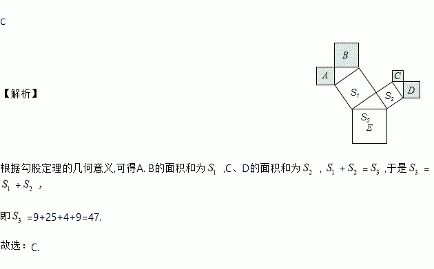 如图是一株美丽的勾股树,其中所有的四边形都是正方形,所有的三角形都是直角三角形.若正方形A,B,C,D的边长分别是3,5,2,3,则最大正方形E的面积是( )