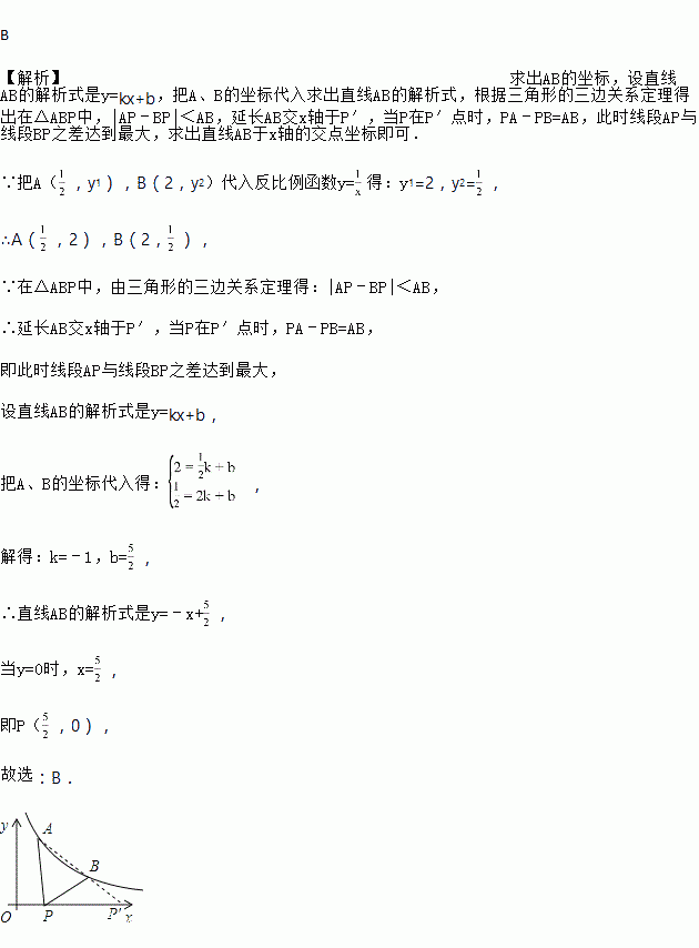 的图像上,动点P(x,0)在x轴正半轴上运动,若AP-BP最大时,则点P的坐标是 ( )