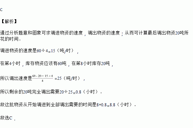 某仓库调拨一批物资,调进物资共用8小时,调进物资4小时后同时开始调出物资(调进与调出的速度保持不变).该仓库库存物资W(吨)与时间t(小时)之间的函数关系如图所示.则这批物资从开始调进到全部调出所需要的时间是( )