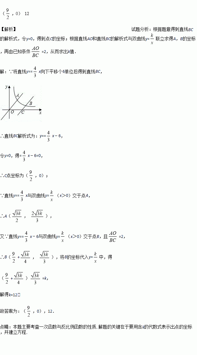 如图,直线y=x与双曲线y=(x>0)交于点A,将直线y=x向下平移个6单位后,与双曲线y=(x>0)交于点B,与x轴交于点C,则C点的坐标为_____;若=2,则k=_____.