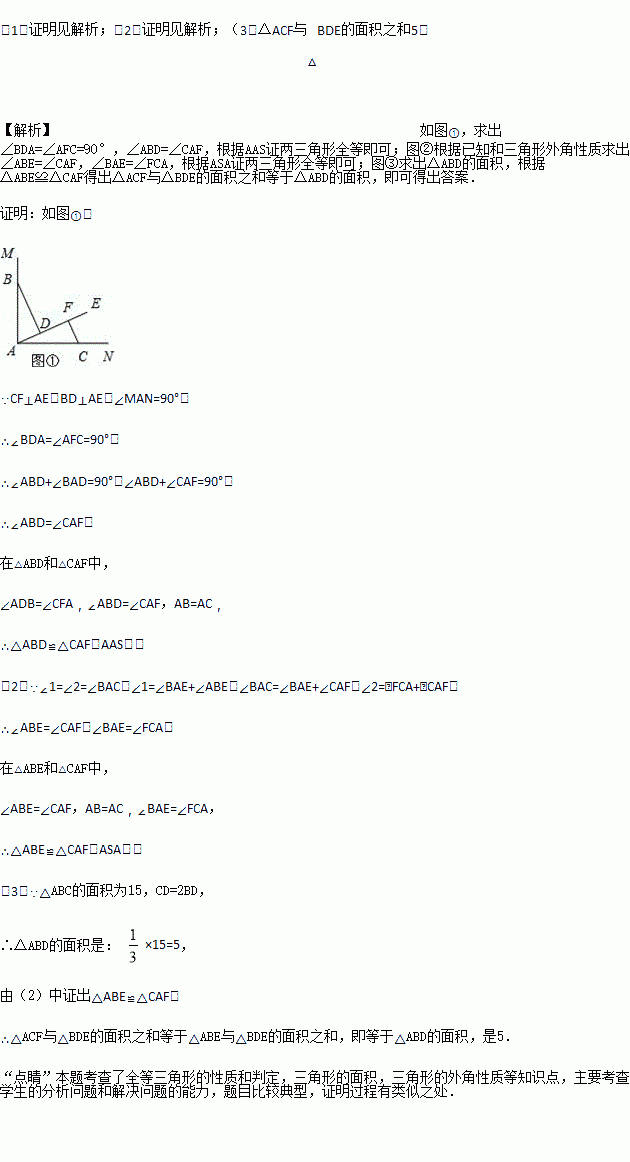 (2)如图2,点B、C分别在∠MAN的边AM、AN上,点E、F都在∠MAN内部的射线AD上,∠1、∠2分别是△ABE、△CAF的外角.已知AB=AC,且∠1=∠2=∠BAC.求证:△ABE≌△CAF;