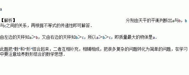 如图,天秤中的物体a、b、c,天秤处于平衡状态,则质量最大的物体是____.