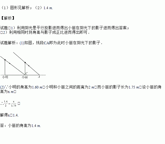 (2)若已知小明的身高为1.60 m,小明和小丽之间的距离为2 m,而小丽的影子长为1.75 m,求小丽的身高.
