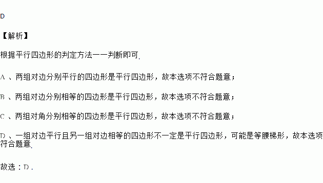 C. 两组对角分别相等 D. 一组对边平行且另一组对边相等
