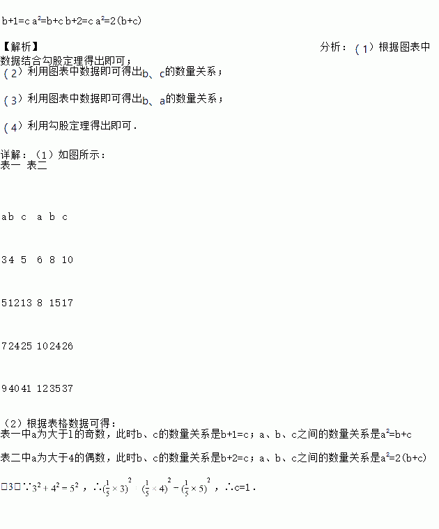 (1)仔细观察,表一中a为大于1的奇数,此时b、c的数量关系是_____________,