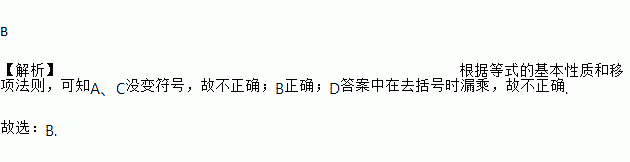B 【解析】根据等式的基本性质和移项法则,可知A、C没变符号,故不正确;B正确;D答案中在去括号时漏乘,故不正确. 故选:B.