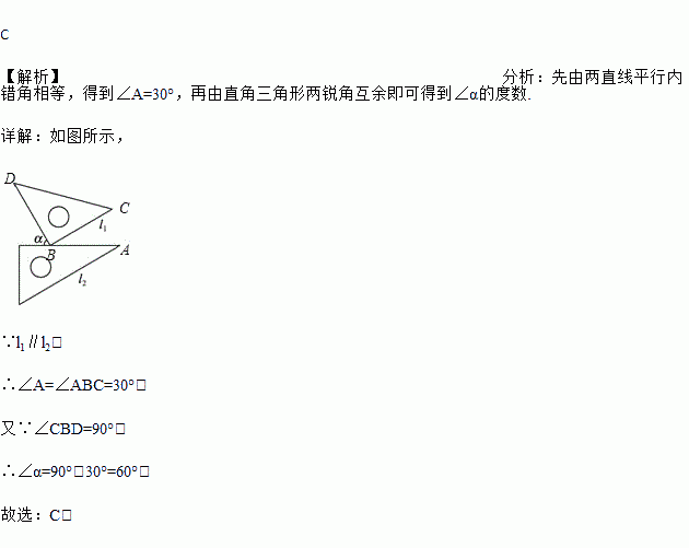 将一副三角尺按如图的方式摆放,其中l1∥l2,则∠α的度数是( )