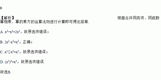 A. x3+x3=x6 B. 2x3-x3=x3 C. x2.x3=x6 D. (x2)3=x5