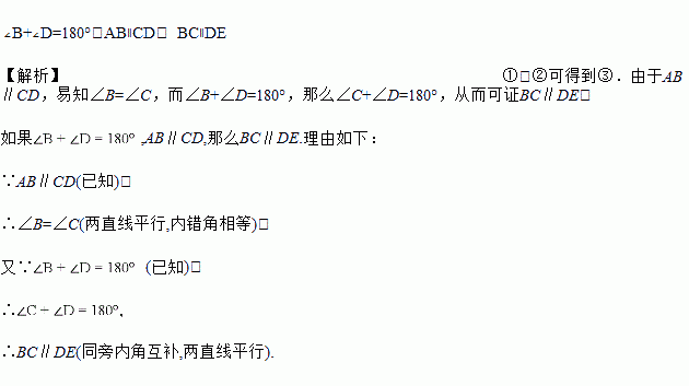 如图,给出下列三个论断:①∠B+∠D=180°;②AB∥CD;③BC∥DE.(1)在上述三个论断中,以其中两个论断作为条件,另外一个论断作结论,写出一个正确的命题,并加以证明。
