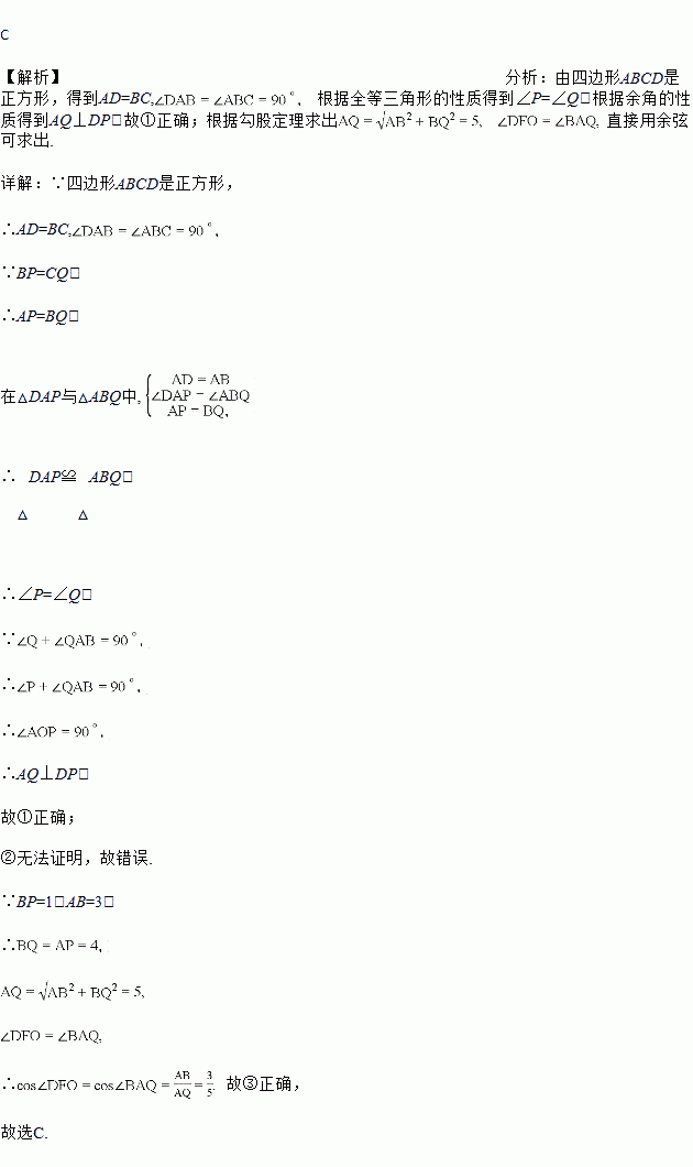如图,四边形ABCD是正方形,点P,Q分别在边AB,BC的延长线上且BP=CQ,连接AQ,DP交于点O,并分别与边CD,BC交于点F,E,连接AE,下列结论:①AQ⊥DP;②△OAE∽△OPA;③当正方形的边长为3,BP=1时,cos∠DFO=