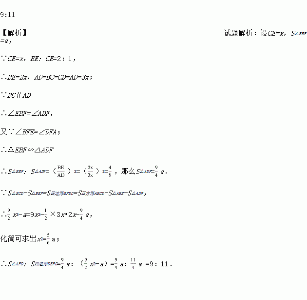 如图所示,在正方形ABCD中,点E是BC边上一点,且BE:EC=2:1,AE与BD交于点F,则△AFD与四边形DFEC的面积之比是________.
