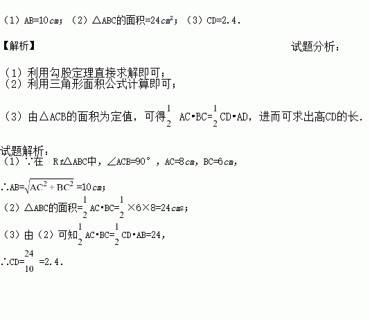 如图,在 Rt△ABC中,∠ACB=90°,AC=8cm,BC=6cm,CD⊥AB于D,求: