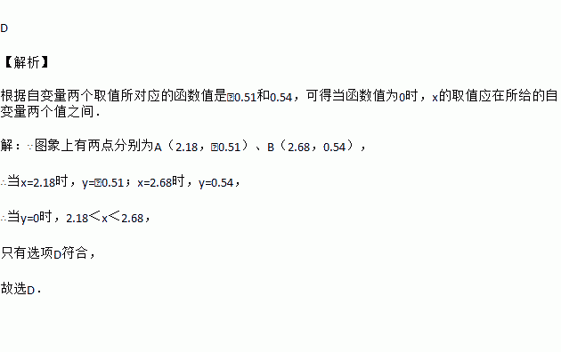 如图是二次函数y=ax2+bx+c的图象,图象上有两点分别为A(2.18,﹣0.51)、B(2.68,0.54),则方程ax2+bx+c=0的一个解只可能是( )