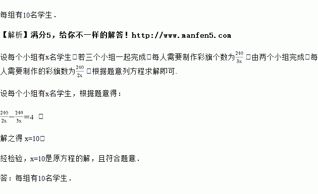 为了迎接市中学生田径运动会,计划由某校八年级(1)班的3个小组制作240面彩旗,后因一个小组另有任务,改由另外两个小组完成制作彩旗的任务.这样,这两个小组的每个同学就要比原计划多做4面彩旗.如果这3个小组的人数相等,那么每个小组有多少名学生?