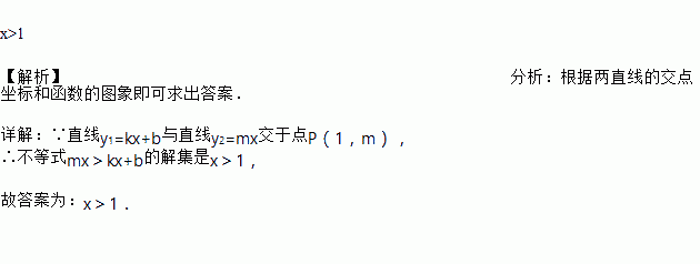 如图,直线y1=kx+b与直线y2=mx交于点P(1,m),则不等式mx>kx+b的解集是 ______