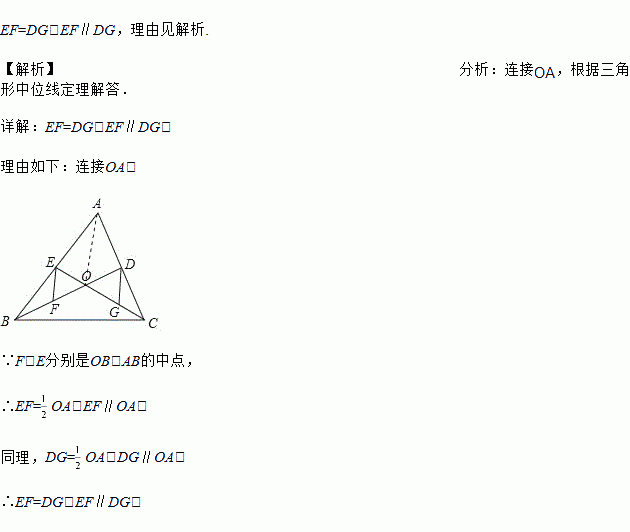 如图,△ABC的中线BD、CE相交于点O,F、G分别是OB、OC的中点,线段EF与DG之间有什么关系?为什么?