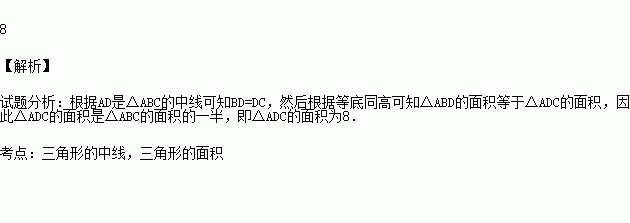 如图,在△ ABC中,AD是中线,△ ABC面积为16,则△ADC的面积为 .