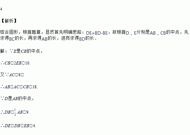 如图,已知点C是线段AB上一点,AC<CB,D,E分别是AB,CB的中点,AC=8,EB=5,求线段DE的长.