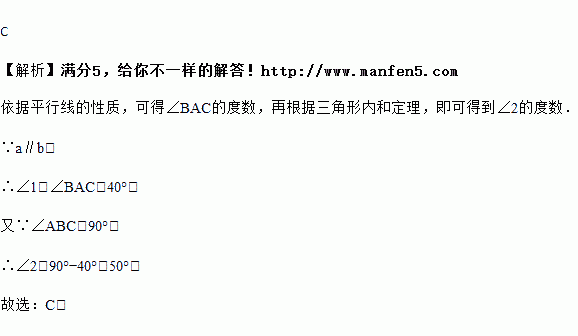 如图,直线a∥b,∠ABC的顶点B在直线a上,两边分别交b于A,C两点,若∠ABC=90°,∠1=40°,则∠2的度数为( )