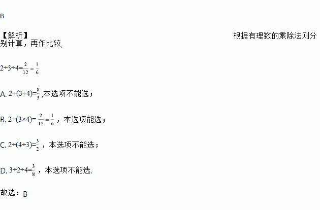 A. 2÷(3÷4) B. 2÷(3×4) C. 2÷(4÷3) D. 3÷2÷4