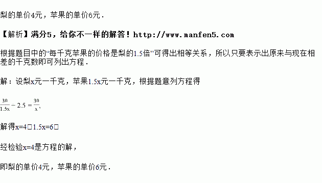 对比两次的电脑小票,MM发现:每千克苹果的价格是梨的1.5倍,苹果的重量比梨轻2.5