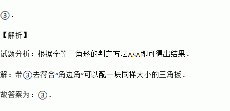 玻璃三角板摔成三块如图,若到玻璃店在配一块同样大小的三角板,最省事的方法带 .