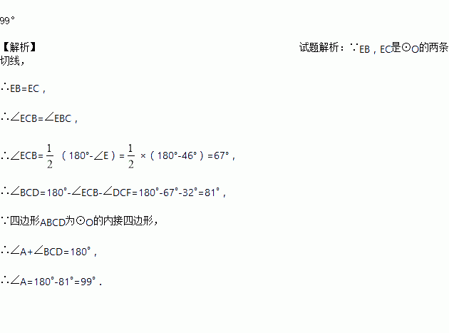 如图,EB,EC是⊙O的两条切线,与⊙O相切于B,C两点,点A,D在圆上.若∠E=46°,∠DCF=32°,则∠A的度数是______°.