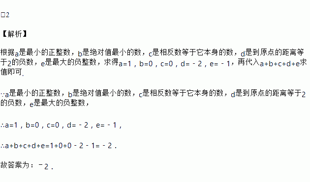 若a是最小的正整数,b是绝对值最小的数,c是相反数等于它本身的数,d是到原点的距离等于2的负数,e是最大的负整数,则a+b+c+d+e=_____.