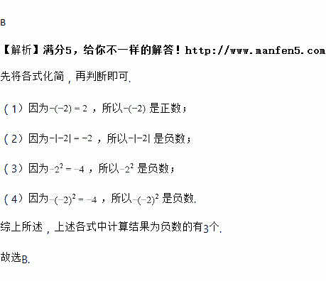下列各式:①-(-2);②-|-2|;③-22;④-(-2)2,计算结果为负数的个数有( )