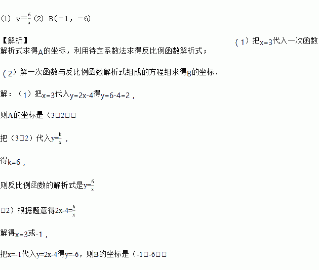 如图,一次函数y=2x-4的图象与反比例函数y=的图象交于A,B两点,且点A的横坐标为3.